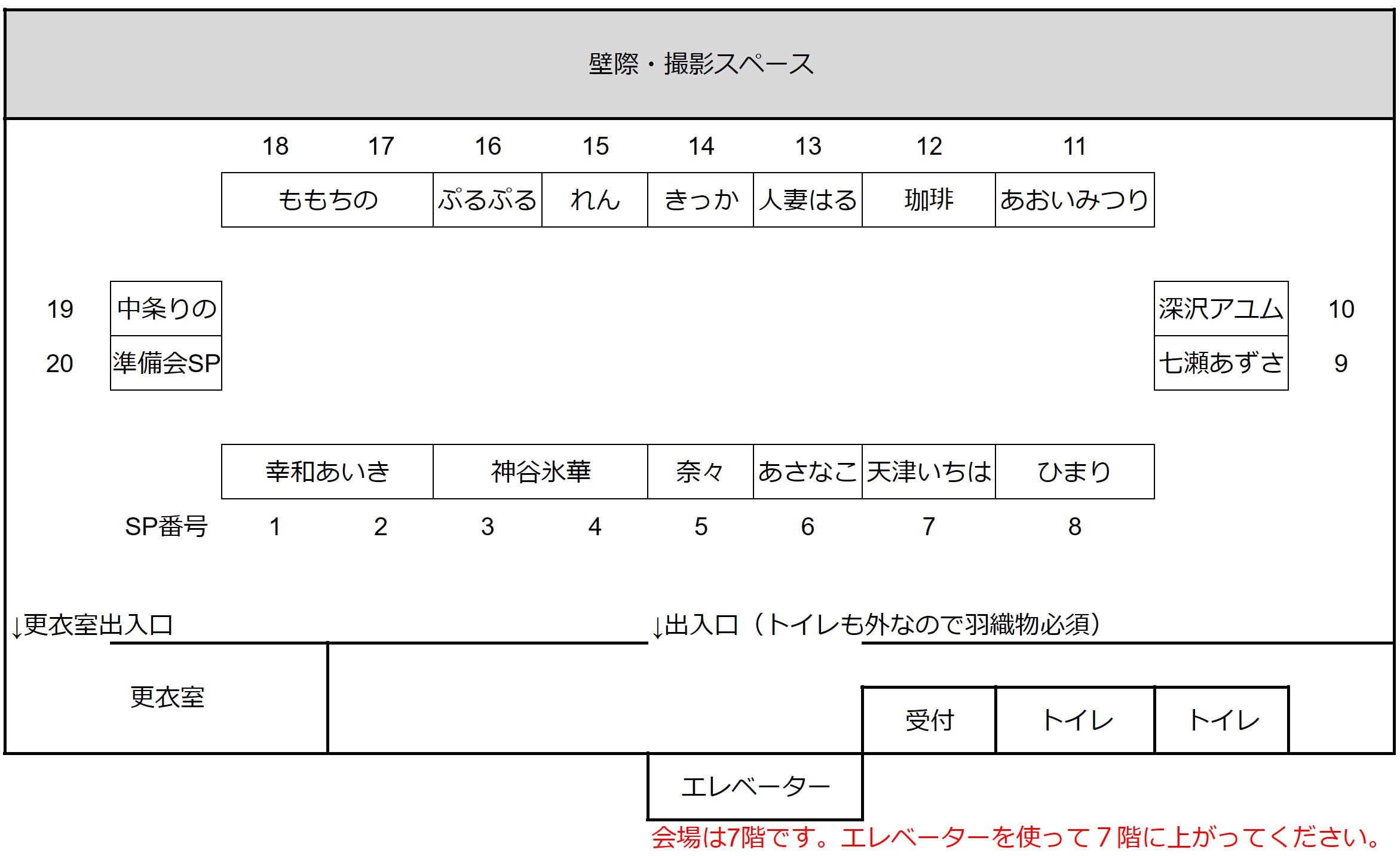 会場は7階のみです。廊下や7階以外の別階で、たむろ・話す・騒ぐ行為はご遠慮ください。